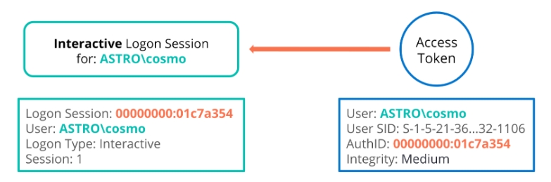 Every single logon session is identifiable by a 64-bit locally unique identifier (LUID), otherwise known as the logon ID. This access token contains an Authentication ID (AuthID) that identifies the logon session via the LUID.