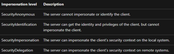 Impersonation (thread tokens) -> Enable a thread to run with a different security context (and hence token).