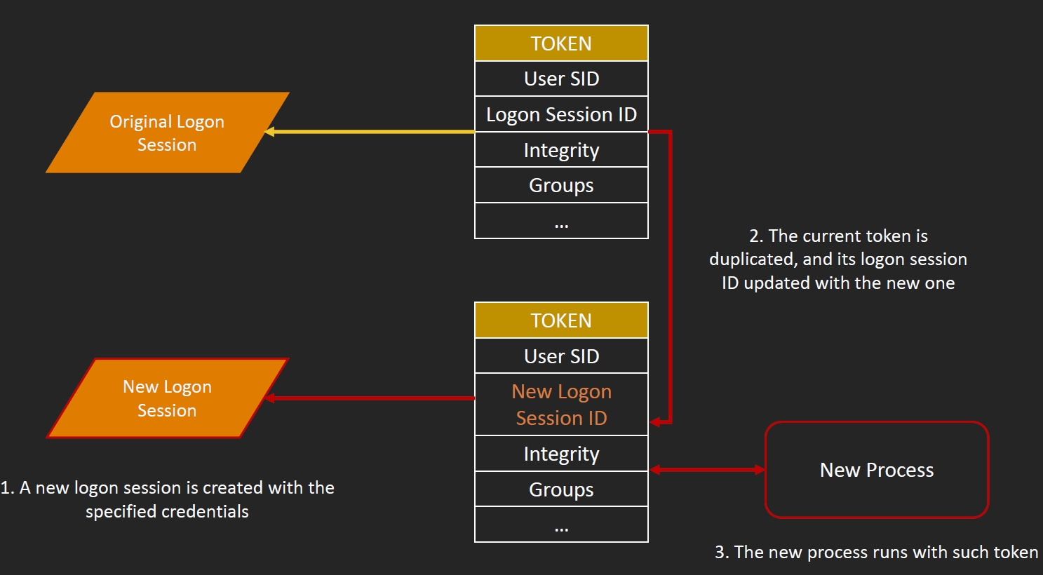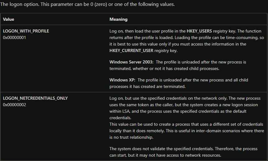 This reason is what leads to tickets and NTLM hashes being cached on the system. How runas.exe works is actually using the Win32 API CreateProcessWithLogon function, which is in charge of the creation of new processes with the new security context.
