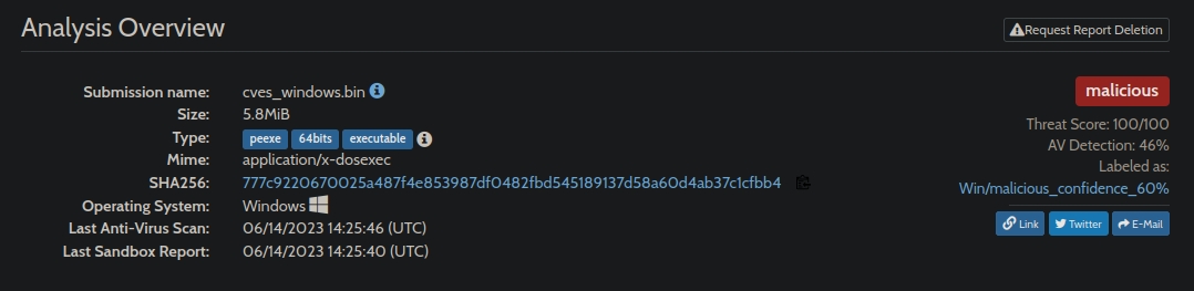 files they install and run on the host. There seems to be 2 types of malware here, one for Windows and one for Linux. According to the news article, it seems that the Linux one can bypass most AVs when uploaded on sites like VirusTotal, while the Windows one is detected by 40 out of 60 scanners.