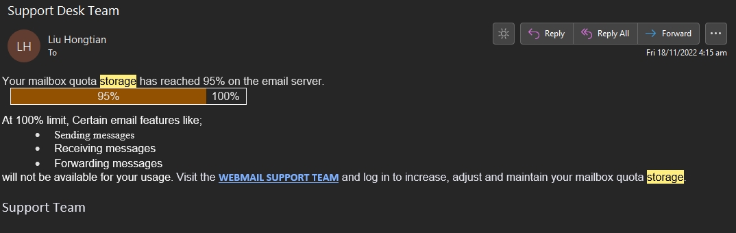 First thing to ask, who is Liu Hongtian? Doing a search on him doesn't tell me anything regarding NUS mail admin. Also, what's with the weird bar graph and font differences in the email?
