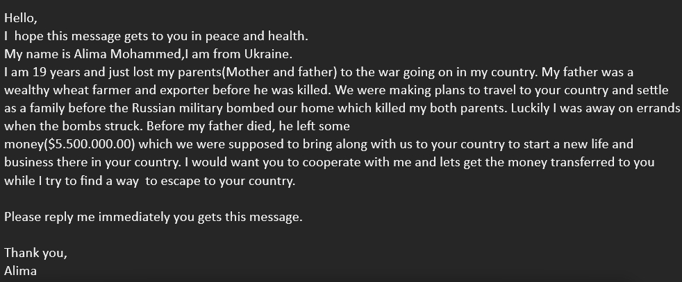 If you read the message, it sounds very...off. Why would a 'war victim' need MY help?