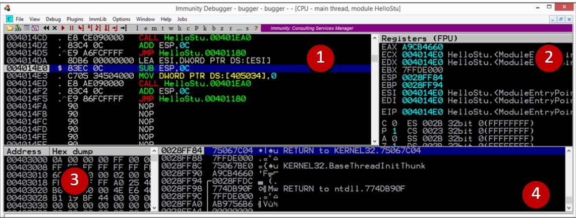 Debuggers are really useful, because they allow for us to view the memory stored within the registers, break the execution flow where needed, and so on.