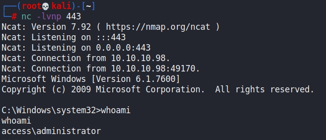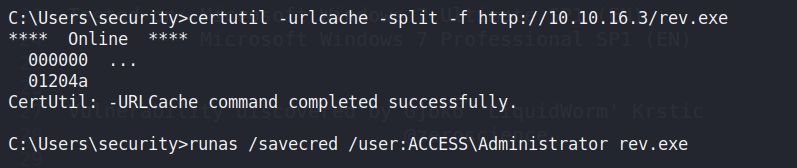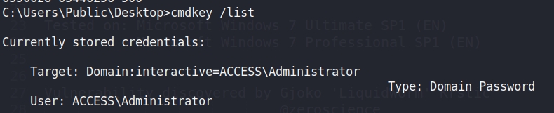 The administrator credentials being cached basically means that we can execute the runas /savecred /user:ACCESS\administrator <binary> command, which is basically a sudo command but on windows.