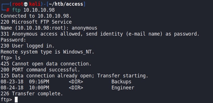When finding FTP open, we can directly check for anonymous login, which works on this machine.