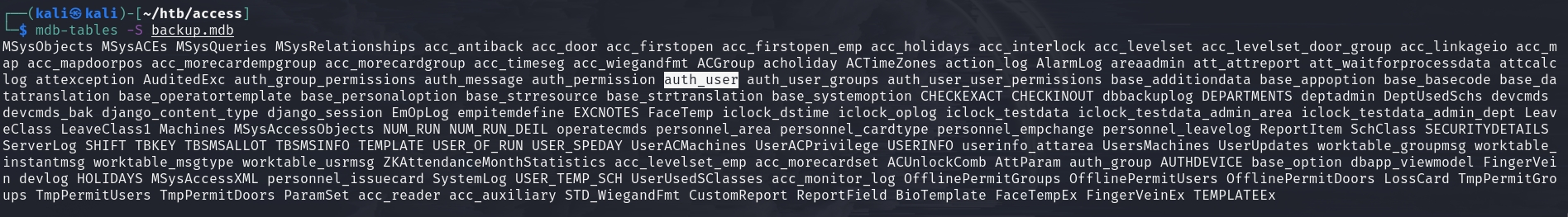 When we open this file up in Kali, we can get some interesting results. There are bunch of table names, with one called auth_user sticking out.