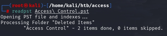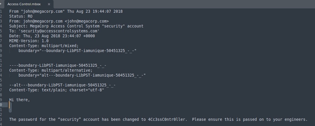 With these credentials, we can unzip the file to find a .pst file. .pst files can be read using readpst. This would generate another .mbox file, which we can read easily.