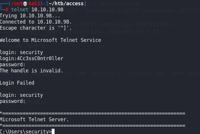 Now we have some credentials. Remembering that there was a Telnet server, we can login easily as the 'security' user.