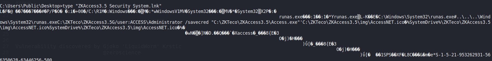 While snooping around on the machine, we can find that in C:\Users\Public\Desktop, there is a .lnk file that contains some hints that there are Administrator credentials being cached on this machine.