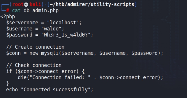 So far, none of the credentials work with FTP or SSH. The next logical step is to take a look at this directory to find an Adminer instance at /utility-scripts/adminer.php