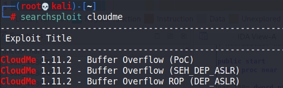 2 Dir(s) 7,564,353,536 bytes freeWhen checking for exploits regarding CloudMe, we can find a few Buffer Overflow exploits that can be used for RCE using shellcode.