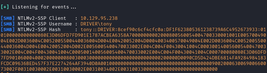 This uses the SCF file to access our machine via SMB, and responder would capture the hash. Create an SCF file like so and start responder.