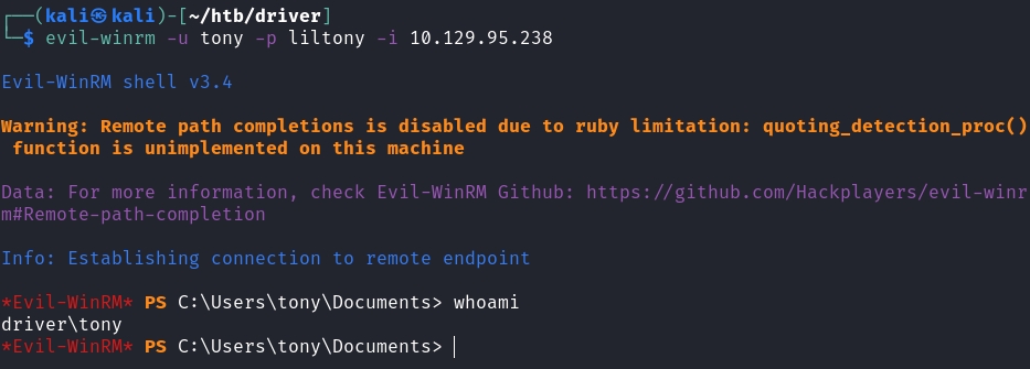 Session completed.We can then log in using evil-winrm since port 5985 is open.