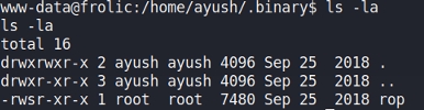 www-data@frolic:/home/ayush/.binary$ ./rop `python2 /tmp/exploit.py`
