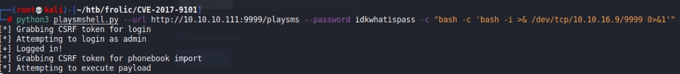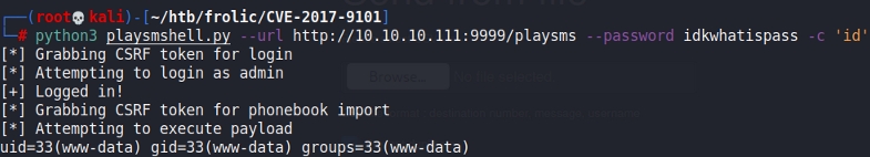 playSMS had a few RCE exploits, so I grabbed one from Github and tried it.