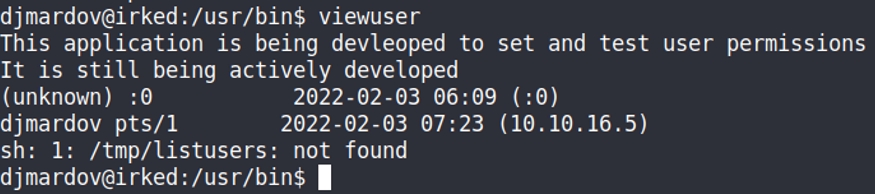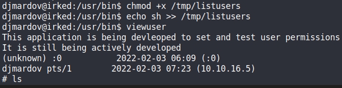Since this file was being run as root due to being an SUID binary, we just need to use the /tmp/listusers file to execute some form of Bash script that would give us a root shell.