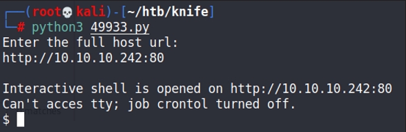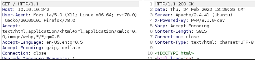 PHP/8.1.0-dev is vulnerable to a publicly available RCE exploit.