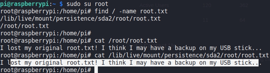 Interesting, because the root flag is where on a USB stick. Now, the backup would probably be some file in a different format and compressed. We know that the flag is a string, so we can use strings to get it out. It is stored at /dev/sdb.
