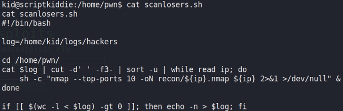 script was running some kind of logger that reads input from /home/kid/logs/hackers