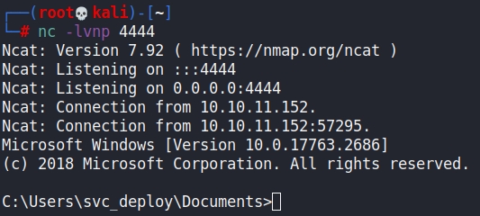 We can use this to gain a reverse shell as the svc_deploy user using whatever method. nc.exe is the easiest.