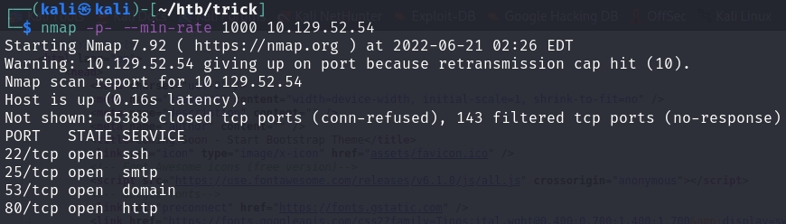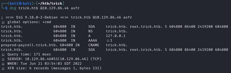 All the ports yield nothing of interest and port 80 was just a corporate website with nothing to interact with. However, when attempting a zone transfer, we would get another domain here: