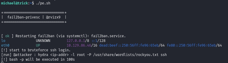 We are given permissions to edit the configuration files for this service in this machine. As such, we can edit the script that is run to gain a reverse shell or create a SUID binary after getting 'banned'. We can force our malicious script to execute after using hydra to brute force SSH many times.