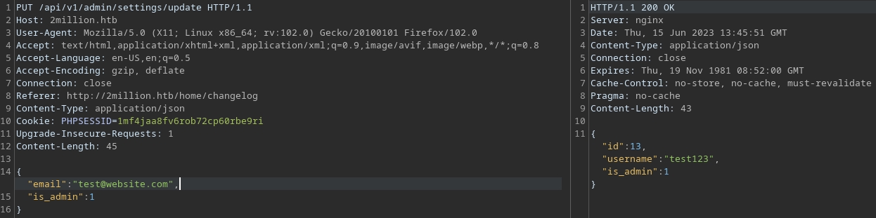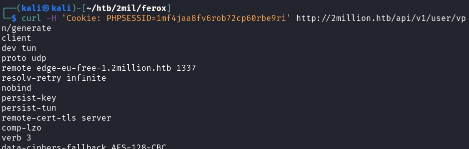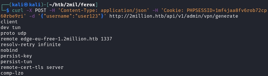 $ curl -X POST -H 'Content-Type: application/json' -H 'Cookie: PHPSESSID=1mf4jaa8fv6rob72cp60rbe9ri' http://2million.htb/api/v1/admin/vpn/generate