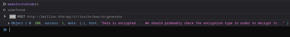 eval(function(p,a,c,k,e,d){e=function(c){return c.toString(36)};if(!''.replace(/^/,String)){while(c--){d[c.toString(a)]=k[c]||c.toString(a)}k=[function(e){return d[e]}];e=function(){return'\\w+'};c=1};while(c--){if(k[c]){p=p.replace(new RegExp('\\b'+e(c)+'\\b','g'),k[c])}}return p}('1 i(4){h 8={"4":4};$.9({a:"7",5:"6",g:8,b:\'/d/e/n\',c:1(0){3.2(0)},f:1(0){3.2(0)}})}1 j(){$.9({a:"7",5:"6",b:\'/d/e/k/l/m\',c:1(0){3.2(0)},f:1(0){3.2(0)}})}',24,24,'response|function|log|console|code|dataType|json|POST|formData|ajax|type|url|success|api/v1|invite|error|data|var|verifyInviteCode|makeInviteCode|how|to|generate|verify'.split('|'),0,{}))This looks like it generates some kind of token. Within it, we can see that it uses a makeInviteCode function. This file is loaded at the /invite directory, which is where we need to submit a code. Within the Javascript Console in Inspector tools, I ran that function.