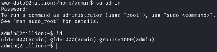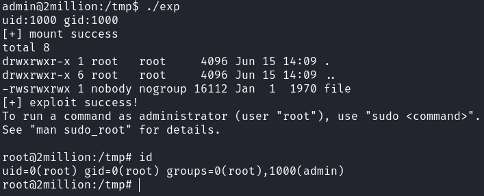 admin@2million:/tmp$ ./fuse ./ovlcap/lower ./gcIn a second shell (over ssh), we can run exp and get a root shell!