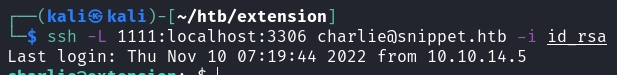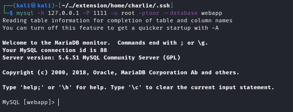 We first need to portforward this MySQL Instance from the machine before moving on. We can do so with SSH using charlie's private key easily. We need to do this because the host does not have mysql...? Perhaps the creator included an extra step on purpose.