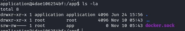 Early enumeration shows that there is a docker.sock in the /app/docker.sock directory. However, we can't run the docker command in this container, so there has to be another way.