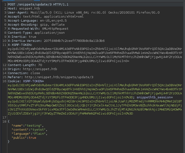 This website allows us to add snippets of code for others to view, or something like that. I tested this out by adding some simple snippet and viewing the request in Burpsuite.