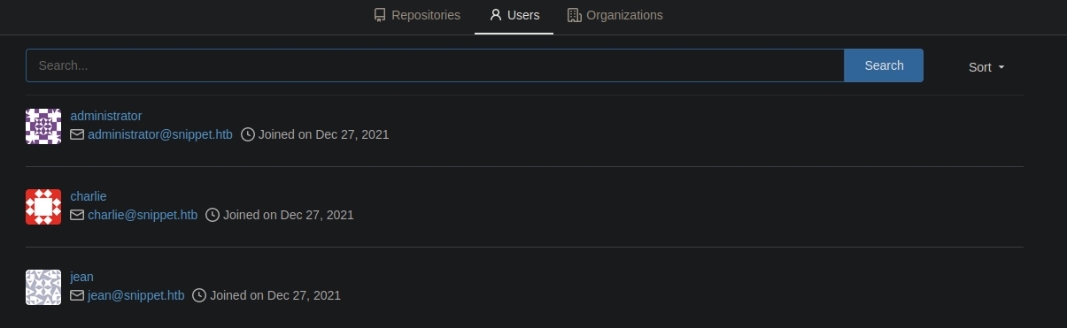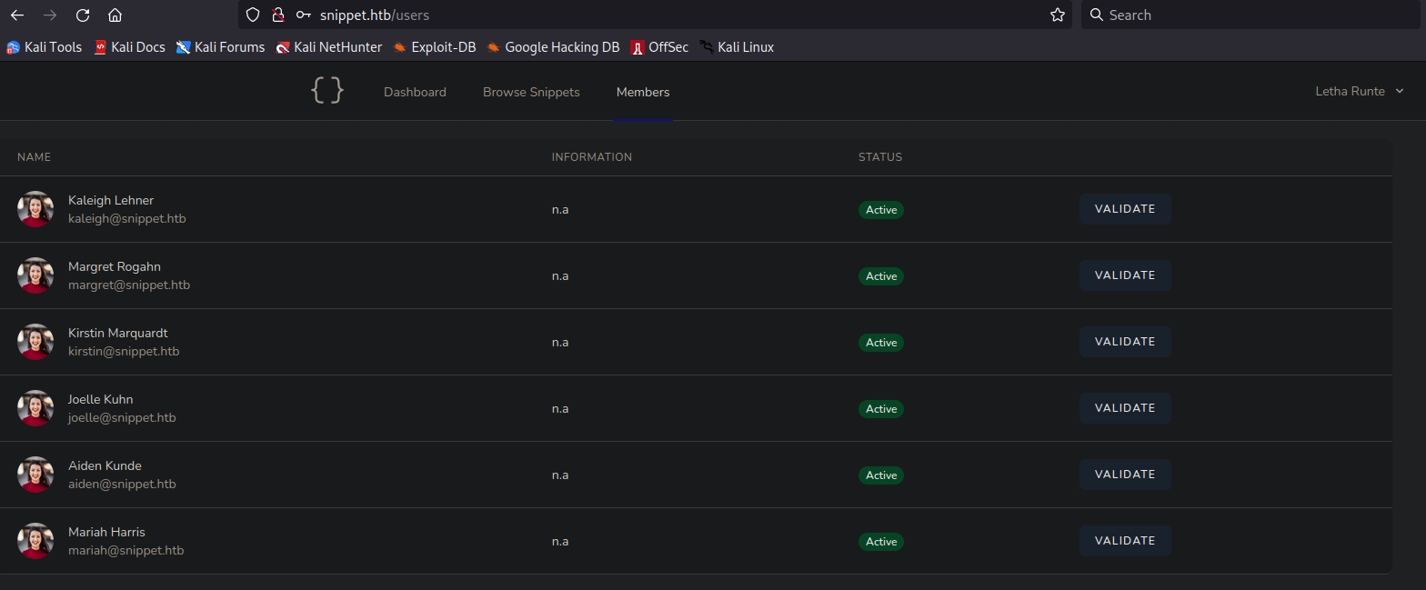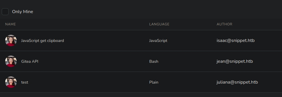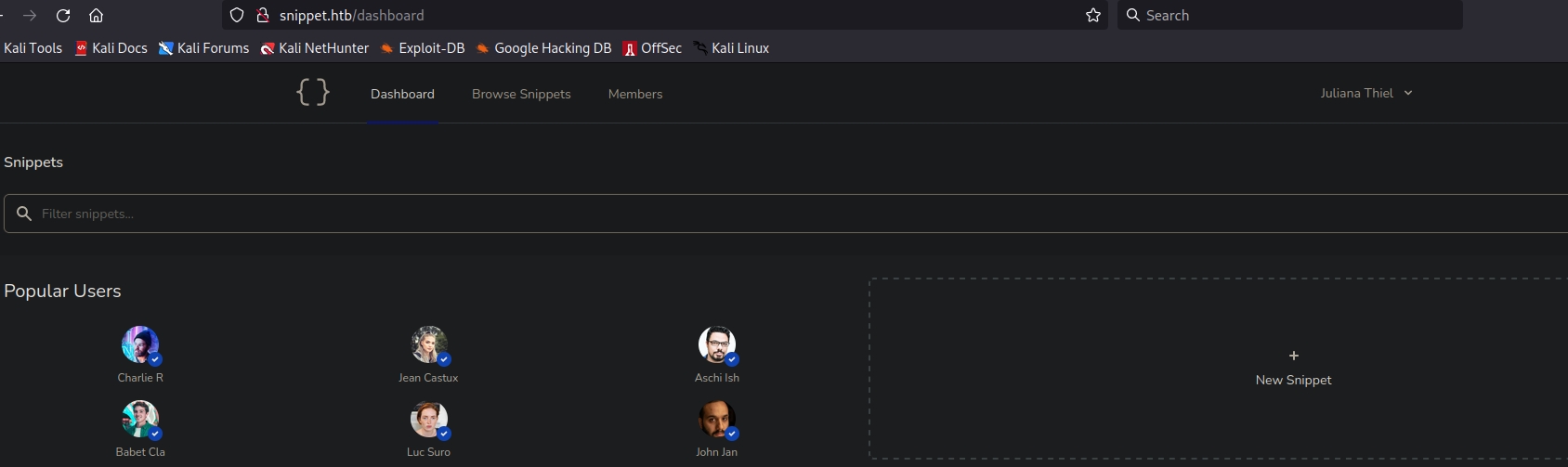 So we have 4 users that are using the same password. Using Juliana's account, I was able to login to the website on snippet.htb