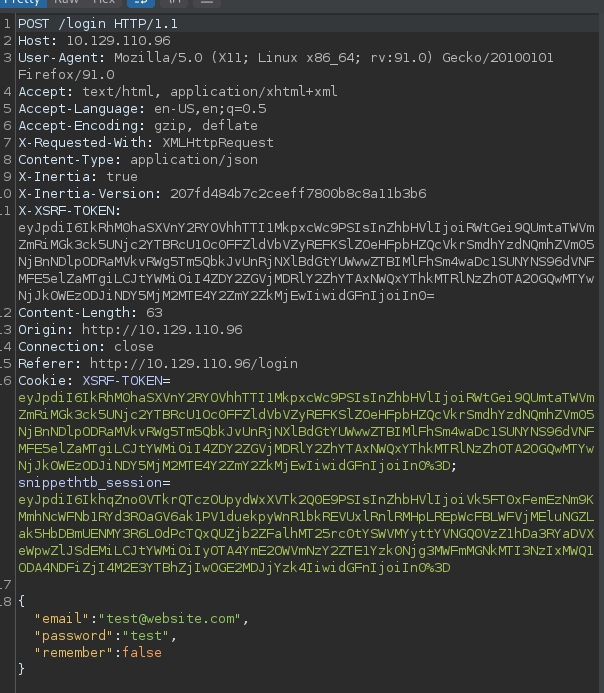 This endpoint takes a POST request, and some fuzzing of the login request using Burp tells us that this takes JSON parameters.