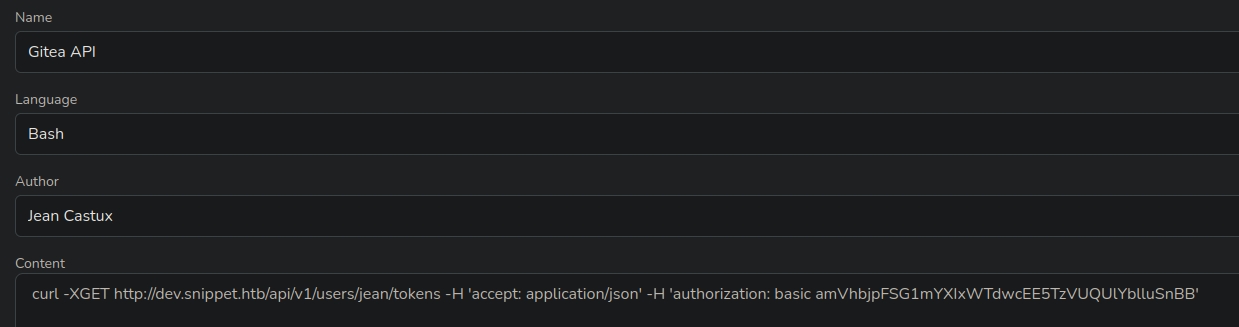 This gives us credentials for jean! We can easily decode from base64 and find the credentials. Then we can login to Gitea as jean.