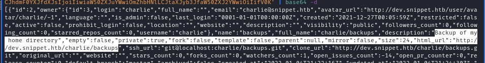 When decoded from base64, we can see that charlie has a backup of his home directory present on this Gitea instance, and pehaps there are SSH keys wthin it.