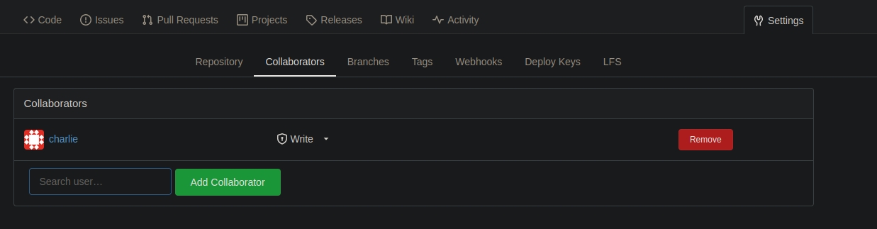 Looking at the repo collaborators, we can see that the user charlie is indeed a collaborator.