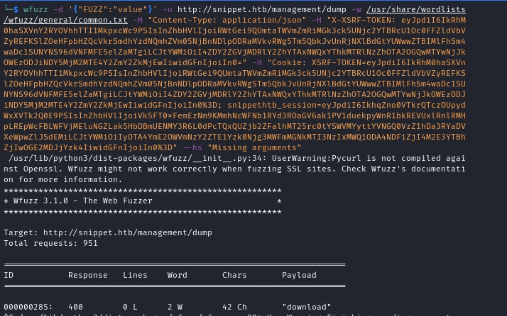 Based on my understanding of /dump endpoints and HTB creators, this thing should dump out a bunch of useful credentials should we find the right argumenst to enter. We have no other hints, so fuzzing this thing is the way forward it seems.