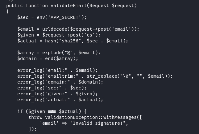 However, based on this code, it uses some kind of APP_SECRET, which I'm too lazy to find. So in this case, we can instead opt to add another user into the database with a command appended to the end in order to gain a reverse shell as the www-data.