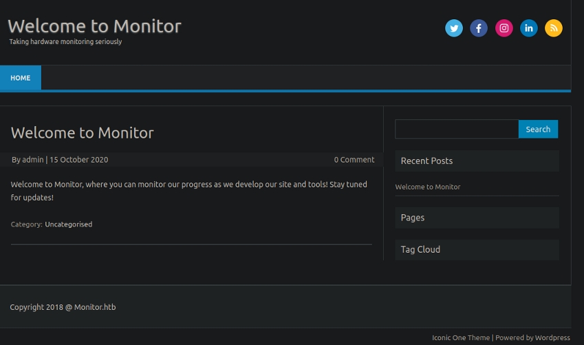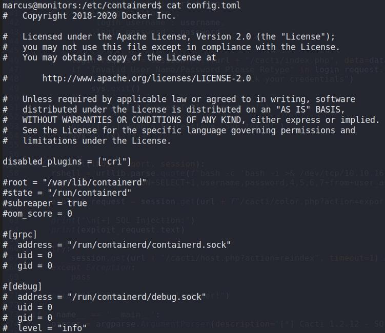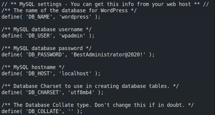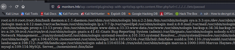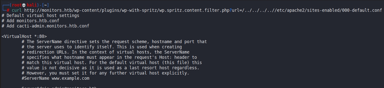 We can find a new domain at cacti-admin.monitors.htb. Afterwards, I also read the Wordpress configuration files at /var/www/wordpress/wp-config.php to find a password.
