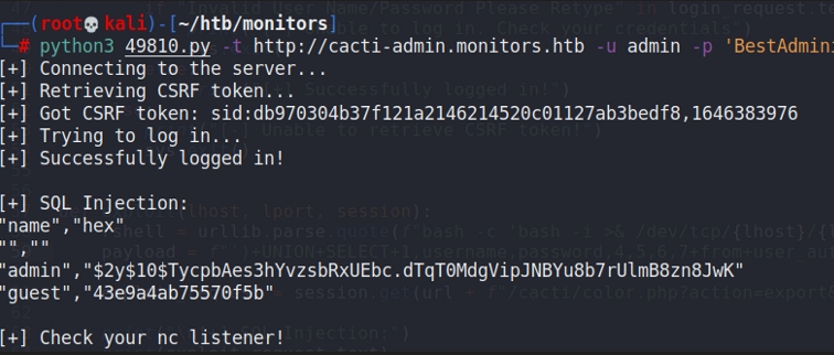 This version of Cacti is old and vulnerable to loads of exploits. We can login with the credentials for Wordpress. Afterwards, we can use an exploit that uses SQL injection to gain a reverse shell.