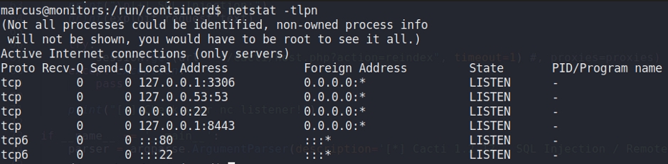 We can check the open ports of this machine via netstat -tulpn to see other open ports.